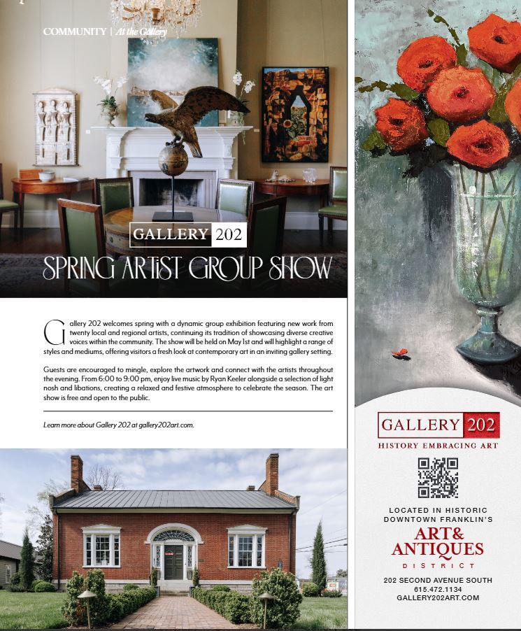 Gallery 202 is a diverse art gallery located in downtown Franklin, TN. As one of the premier art galleries in Franklin we are dedicated to the art lover and collector. We offer an array of artistic styles and mediums including: Paintings, Antiques, Glass, Jewelry, Pottery and Sculpture.